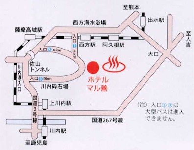南九州道・薩摩川内都ICから国道3号線を北上、約14キロ、25分。